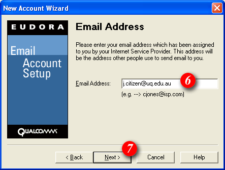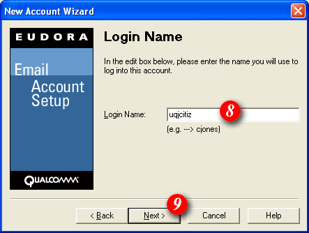 8)By default Eudora will enter part of your email address as the username. Delete this information and enter your 'email address' (for example: me@mydomain.com). | ||