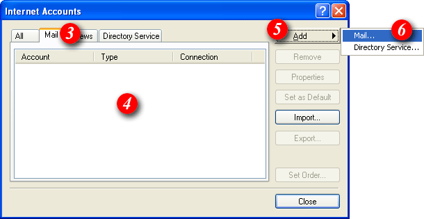 | 2)Select 'Accounts'. (Note: if you see 'Services' instead of accounts, Outlook 2000 is running in Corporate mode and you should not continue with this guide. Please return to the main page and select the Outlook 2000 Corporate mode guide). | |||||