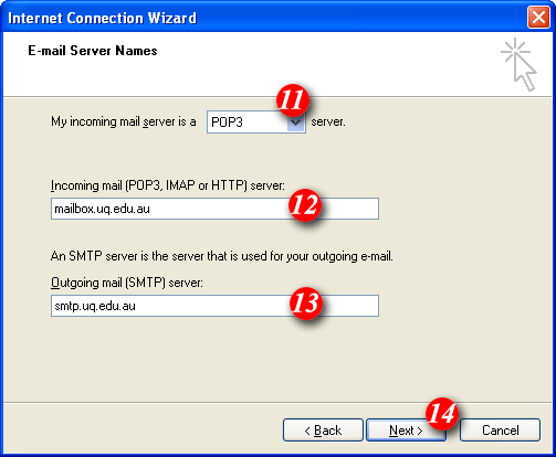 | 11)'My incoming mail server is a .. ' should be set to POP3 (default setting). | |||||