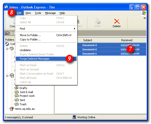 9)Select 'Purge Deleted Messages' - all mail in a status of 'Deleted' will be removed from your Inbox