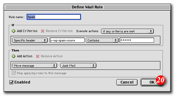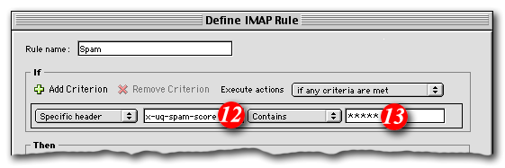 For example, if you wanted to consider anything with a score of 3 or more to be spam, the rule would look like: 'X-SpamDetect: ***'. Decreasing the number of asterisks will result in classifying more e-mails as spam. You may need to check your spam folder more carefully for non-spam e-mails that might have been classified as spam. If you wanted to rate anything with a score of 8 or greater as spam, the rule would look like: 'X-SpamDetect: ********'. Increasing the number of asterisks may result in fewer filtered e-mails being classified as spam and more potential spam staying in your Inbox.