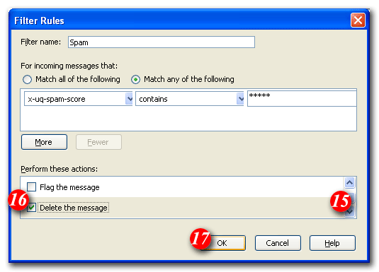 For example, if you wanted to consider anything with a score of 3 or more to be spam, the rule would look like: 'X-SpamDetect: ***'. Decreasing the number of asterisks will result in classifying more e-mails as spam. You may need to check your spam folder more carefully for non-spam e-mails that might have been classified as spam. If you wanted to rate anything with a score of 8 or greater as spam, the rule would look like: 'X-SpamDetect: ********'. Increasing the number of asterisks may result in fewer filtered e-mails being classified as spam and more potential spam staying in your Inbox.